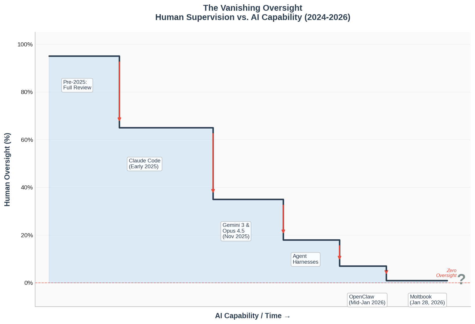 If you plot human oversight against AI capability, you don’t get the relationship you might expect. Oversight doesn’t increase with capability (to manage more powerful systems more carefully). It doesn’t stay flat (maintaining consistent verification regardless of capability). It decreases—and it decreases with specific, identifiable drops that correspond to moments when the industry collectively decided that checking was no longer worth the effort.